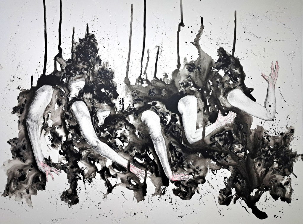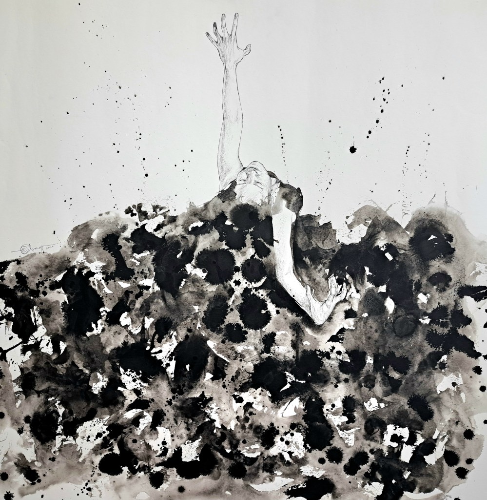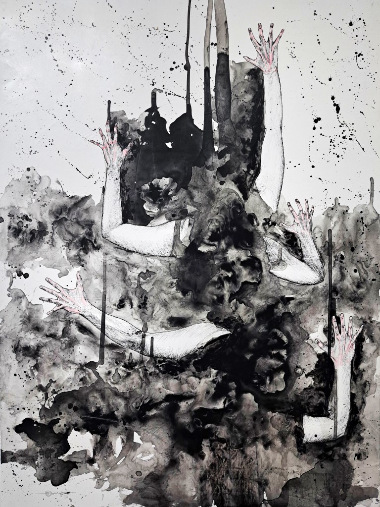Panch references both 1950s action painting and a hint of Ernst’s decalcomania, grafting his compositions with renderings of human appendages in the overwhelming swirl of enduring, his tribute and acceptance of the fate not only of his own birthplace, but of a human condition that harks back to the myths of Gilgamesh and Noah, that of nature both purging, cleansing and testing our will, our dominance on terra firma, our right and reward to be, resilient and rightfully balanced as the stewards of the terrible beauty that we have come to call Mother Nature.